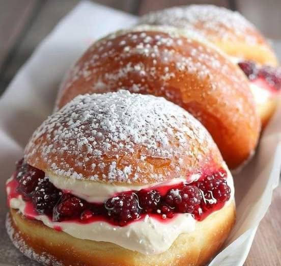 Serveeradvies: Deze donuts smaken het beste als ze nog licht warm zijn, kort na bereiding, wanneer de buitenkant nog iets knapperig is en de vulling lekker romig blijft. Zet erbij bijvoorbeeld een kop koffie, thee of een glas koude melk voor een volledig genotmoment. Voor een feestelijke touch kun je extra aardbeischijfjes op de schaal leggen of een klein toefje slagroom erbij serveren.